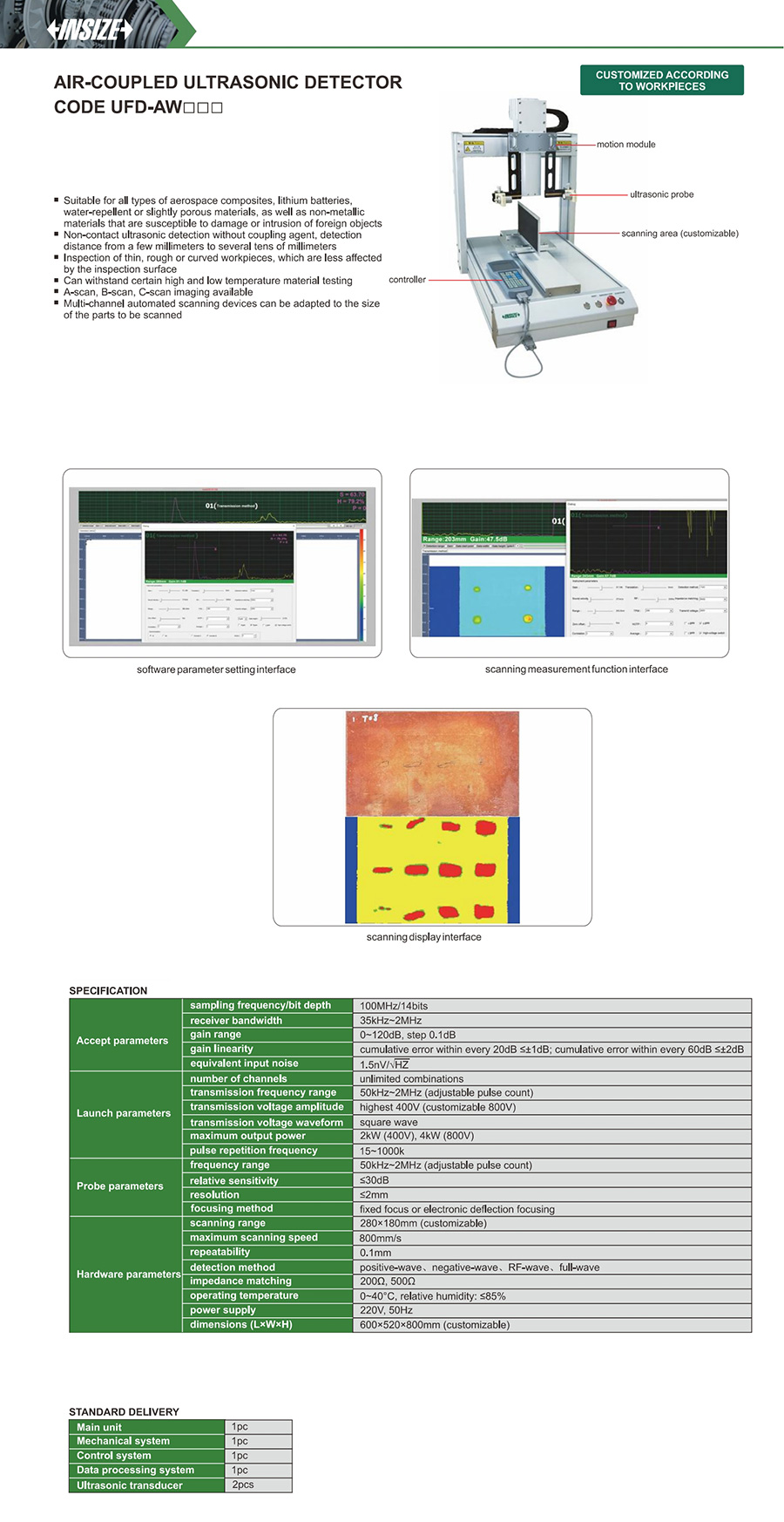 UFD-AW□□□ ≤2mm 0.1mm 800mm/s 0~120dB, step 0.1dB 35kHz~2MHz 50kHz~2MHz ≤30dB