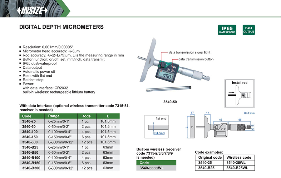 3540-B300WL 0-300mm/0-12" 0.001mm/0.00005" built-in wireless 63mm