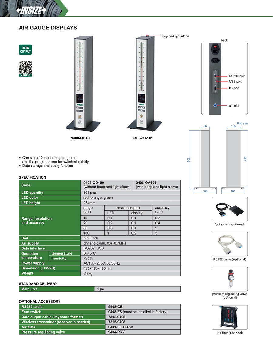 9408-QD100 (without beep and light alarm) 10μm, 20μm, 50μm, 100μm 0.2μm, 0.4μm, 1μm, 3μm LED: 0.1μm, 0.2μm, 0.5μm, 1μm, display: 0.1μm, 0.1μm, 0.1μm, 0.2μm