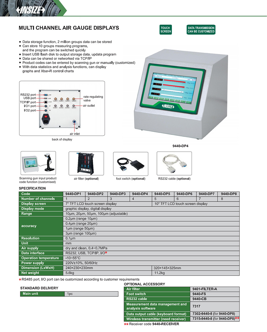 9440-DP8 10μm, 20μm, 50μm, 100μm (adjustable) 0.2μm (range 10μm), 0.4μm (range 20μm), 1μm (range 50μm), 3μm (range 100μm) 0.1μm