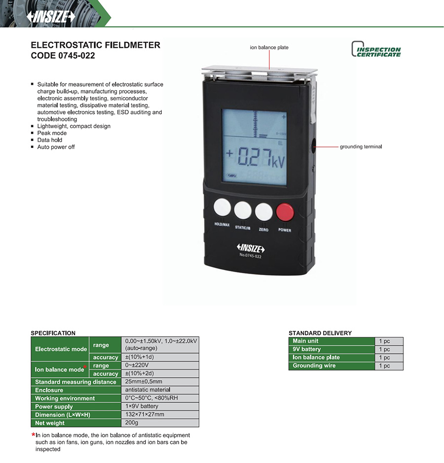 0745-022 0.00~±1.50kV, 1.0~±22.0kV (auto-range) 0~±220V 25mm±0.5mm
