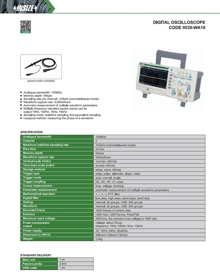 9530-WA10 2 100MHz 1GSa/s (non-interleaved mode) ≤3.5ns 64kpts 5000wfms/s