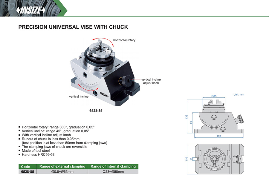 | 6528-85 | 0.05° | Ø0.8~Ø63mm | Ø23~Ø58mm |