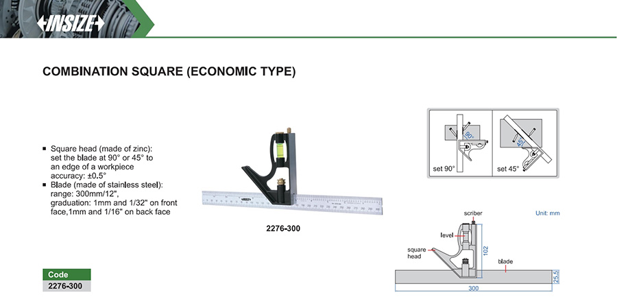 Square head (made of zinc): set the blade at 90° or 45° to an edge of a workpieceaccuracy: ±0.5°