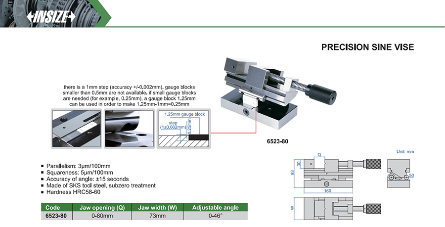 Code Jaw opening (Q) Jaw width (W) Parallelism Squareness Adjustable angle