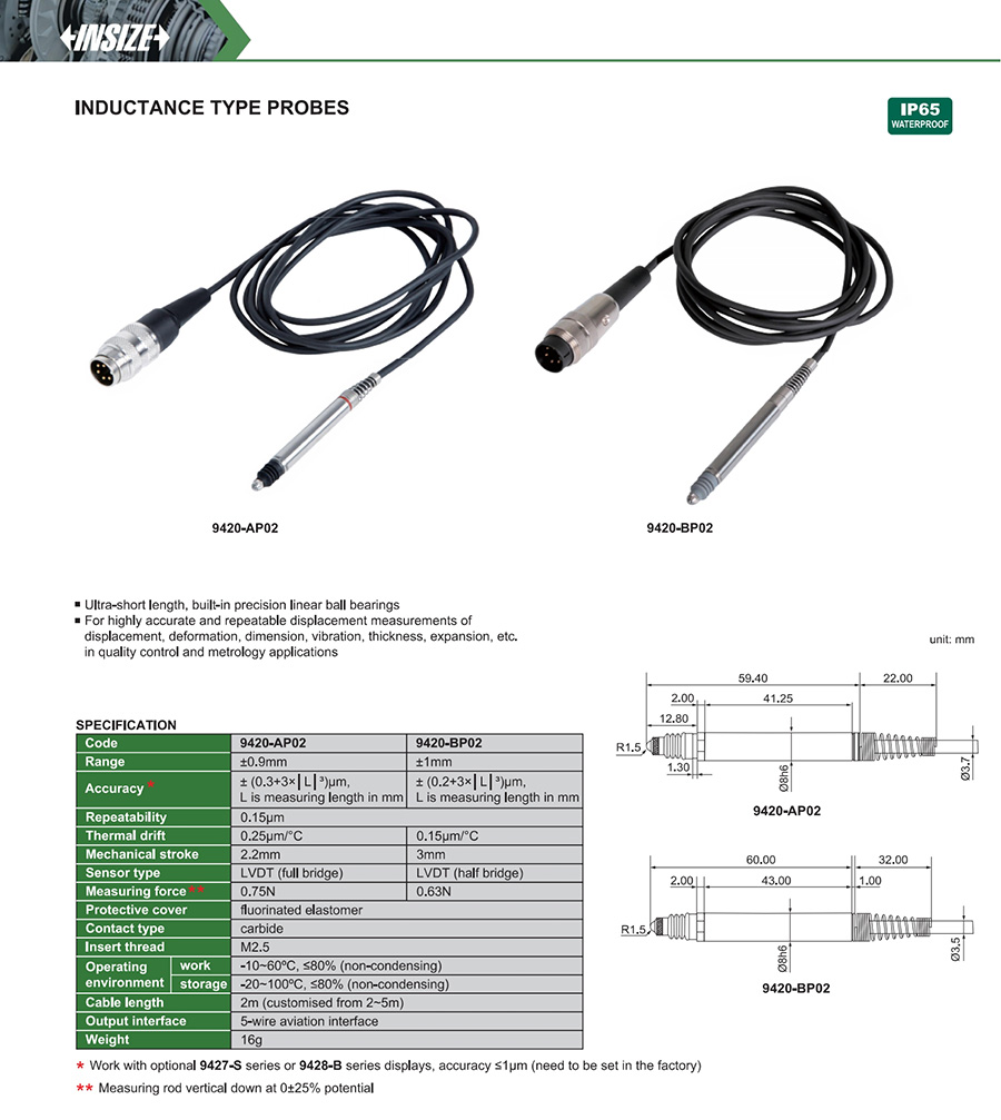 9420-AP02 inductance lvdt (full bridge) ±0.9mm ±0.3+3×│L│³μm, (L is measuring length in mm)