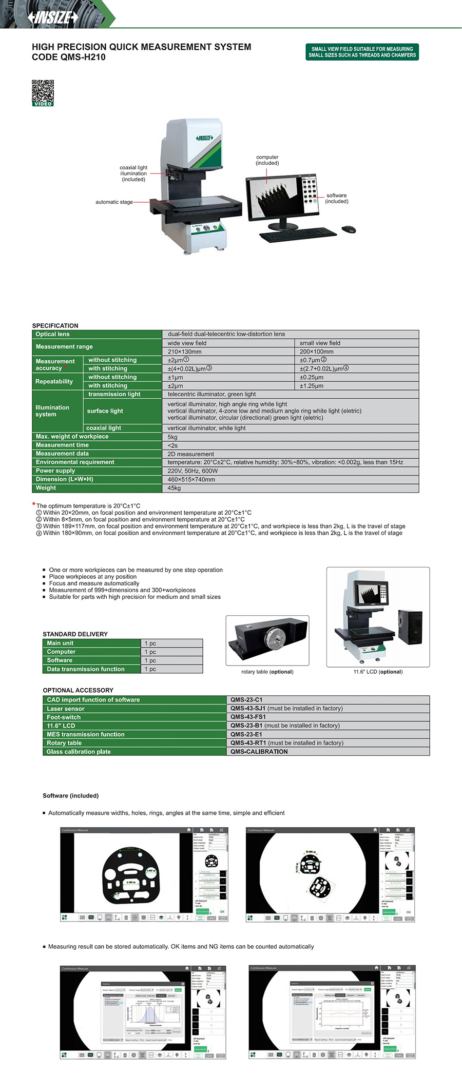 | QMS-H210 | wide view field:210×130mm/ small view field:200×100mm | wide view field:±2μm/ small view field:±0.7μm | wide view field:±(4+0.02L)μm/ small view field:±(2.7+0.02L)μm | wide view field:±1μm/ small view field:±0.25μm | wide view field:±2μm/ small view field:±1.25μm | 5kg |