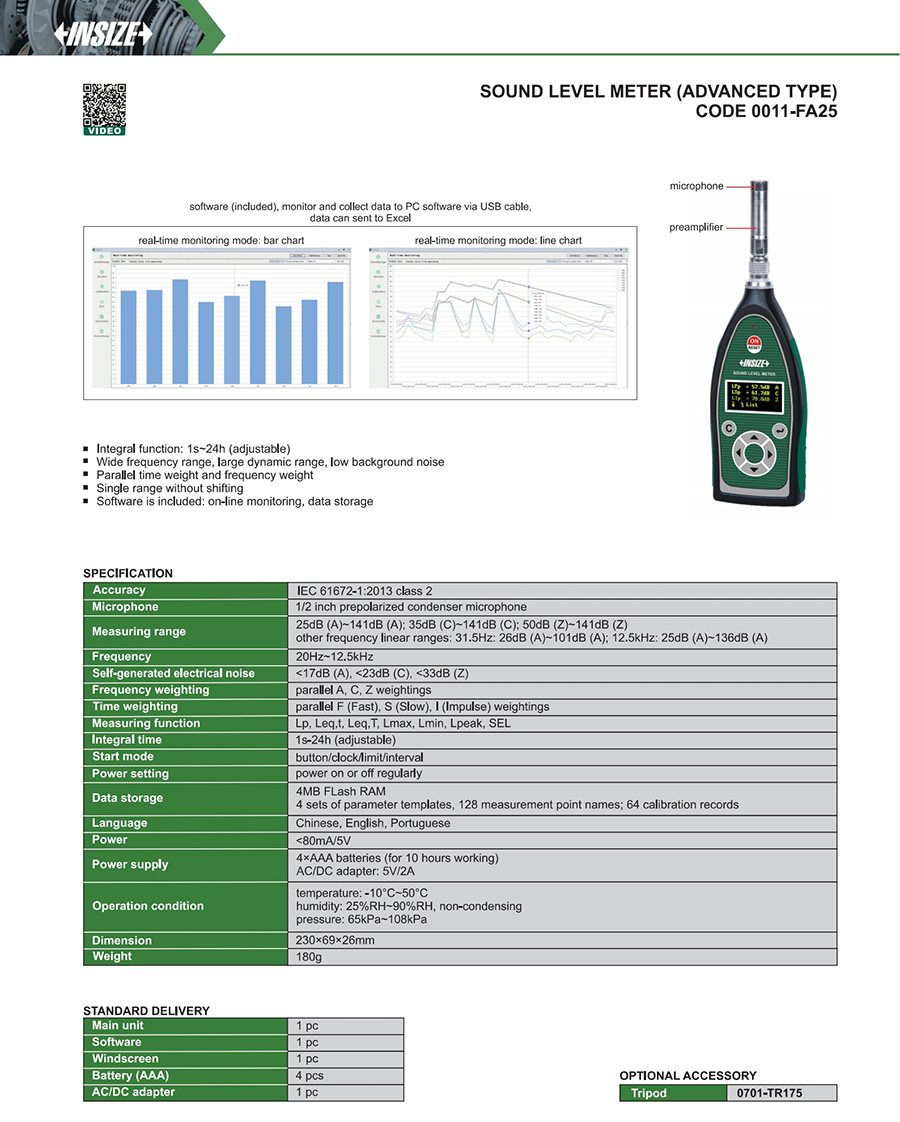 0011-FA25 IEC 61672-1:2013 class 2 20Hz~12.5kHz parallel A, C, Z weightings yes