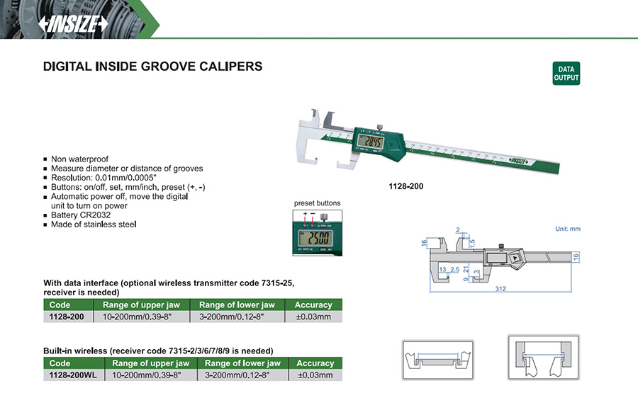 1128-200 10-200mm/0.39-8" 3-200mm/0.12-8" ±0.03mm 0.01mm/0.0005" with data interface