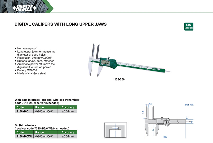 1138-200WL 0-200mm/0-8" ±0.04mm 0.01mm/0.0005" built-in wireless