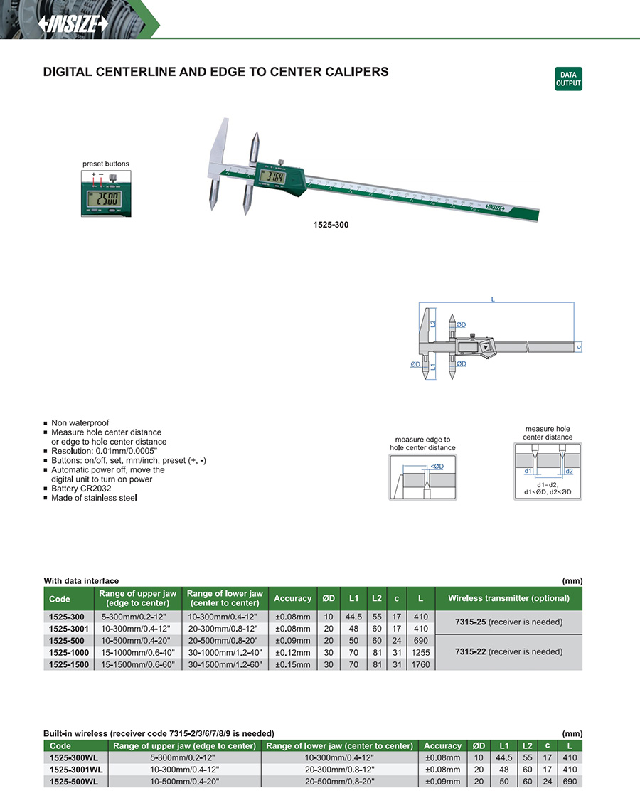 1525-500WL edge to center: 10-500mm/0.4-20" center to center: 20-500mm/0.8-20" ±0.09mm 0.01mm/0.0005" built-in wireless