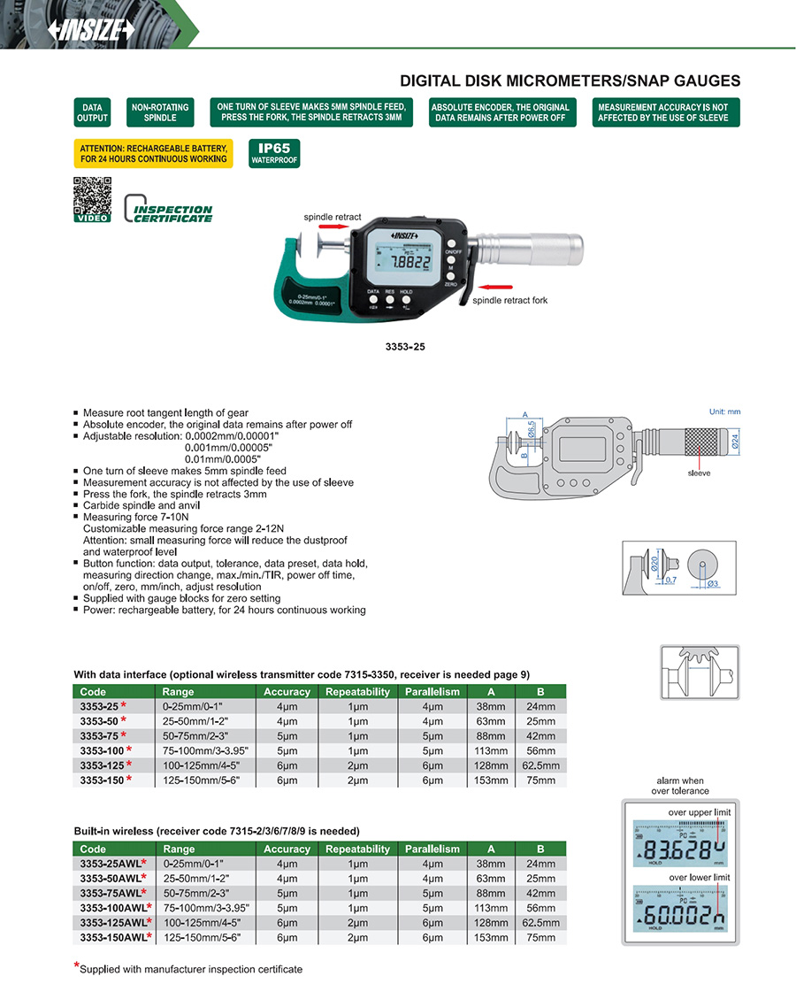 3353-125AWL 100-125mm/4-5" 6µm 0.0002mm/0.00001", 0.001mm/0.00005", 0.01mm/0.0005" built-in wireless