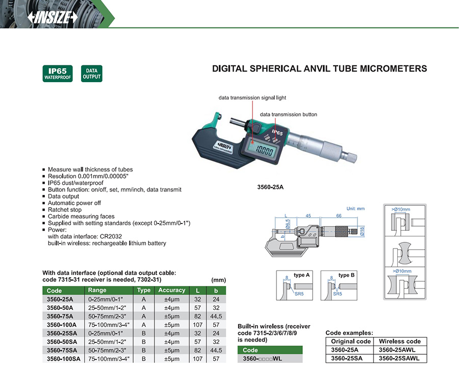 3560-75A A 50-75mm/2-3" ±5μm 0.001mm/0.00005" with data interface