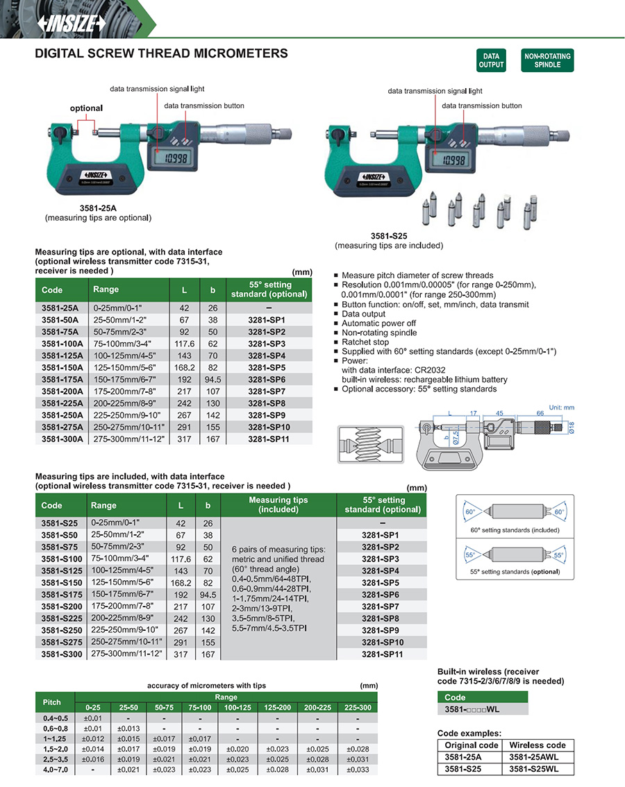 3581-25AWL 0-25mm/0-1" 0.001mm/0.00005" built-in wireless measuring tips are optional