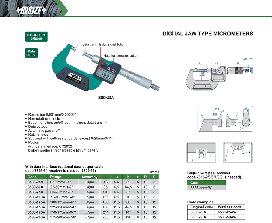 3583-100AWL 75-100mm/3-4" ±5μm 0.001mm/0.00005" built-in wireless