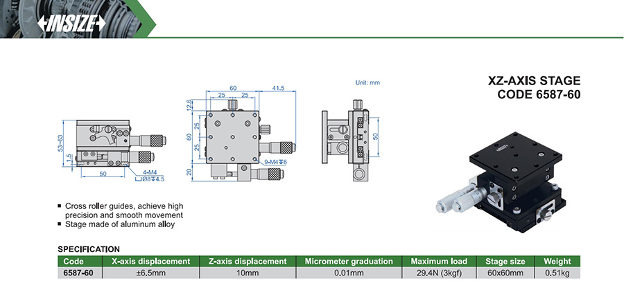 Code X-axis displacement Z-axis displacement Micrometer graduation Stage size