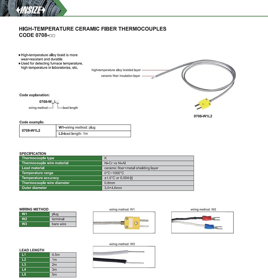 0708-□□ K thermocouple 0°C~1000°C ±1.5°C or 0.004∙|t|