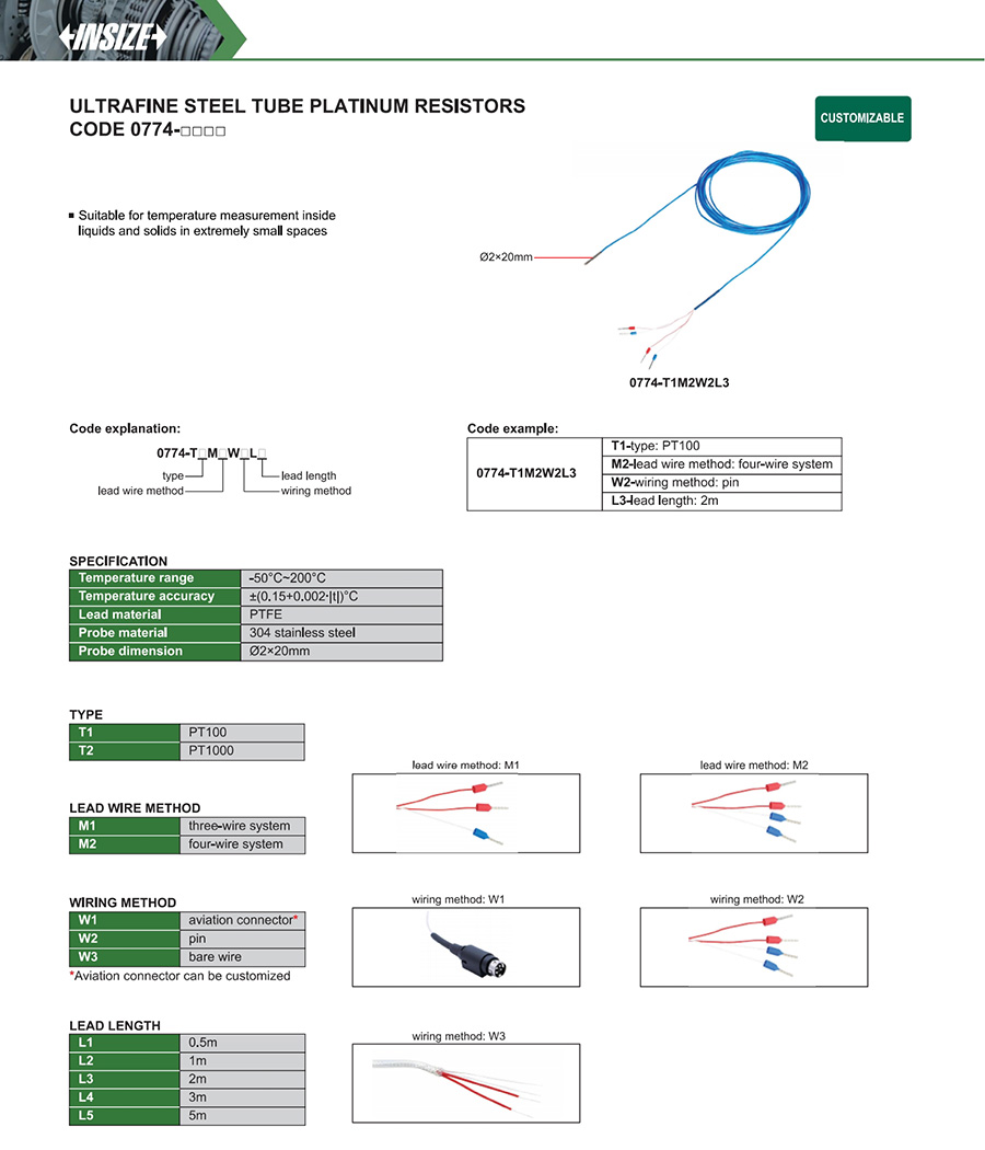 0774-□□ PT100, PT1000 platinum resistor -50°C~200°C ±(0.15+0.002∙|t|)°C