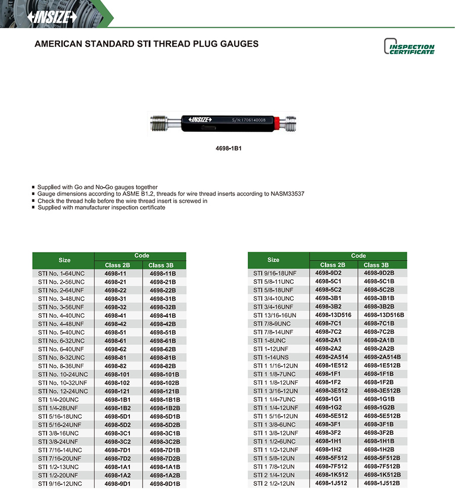 Gauge dimensions according to ASME B1.2, threads for wire thread inserts according to NASM33537