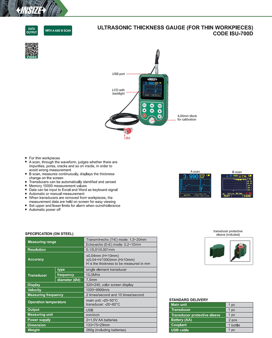 ISU-700D T-E: 1.5~20mm, E-E: 0.2~10mm ±0.04mm (H<10mm), ±(0.04+H/1000)mm (H≥10mm) 15.0MHz USB 1000~9999m/s 7.5mm