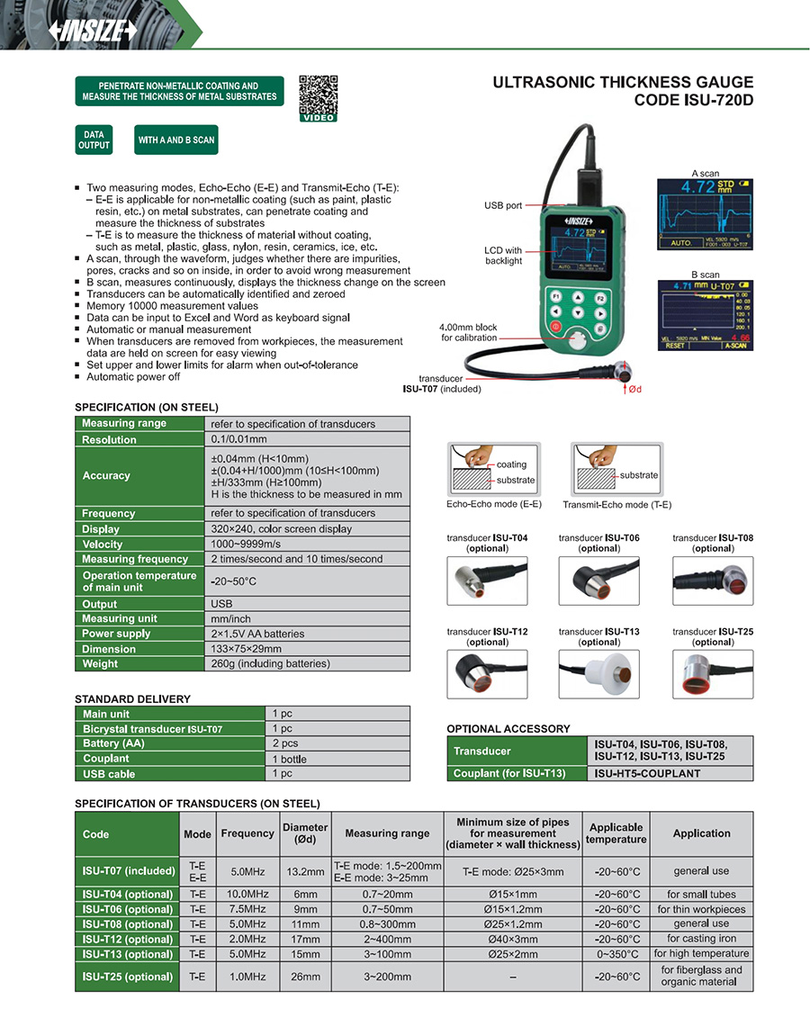 | ISU-720D | T-E mode: 1.5~200mm, E-E mode: 3~25mm | ±0.04mm (H<10mm), ±(0.04+H/1000)mm (10≤H<100mm), ±H/333mm (H≥100mm) | 5.0MHz | USB | 1000~9999m/s | 13.2mm |