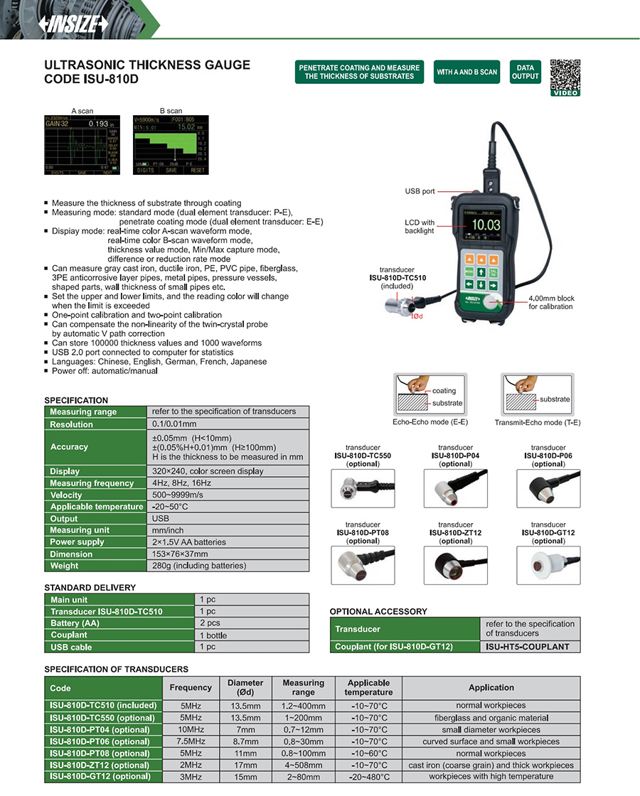 ISU-810D 1.2~400mm ±0.05mm (H<10mm), ±(0.05%H+0.01)mm (H≥100mm) 5MHz USB 500~9999m/s 13.5mm