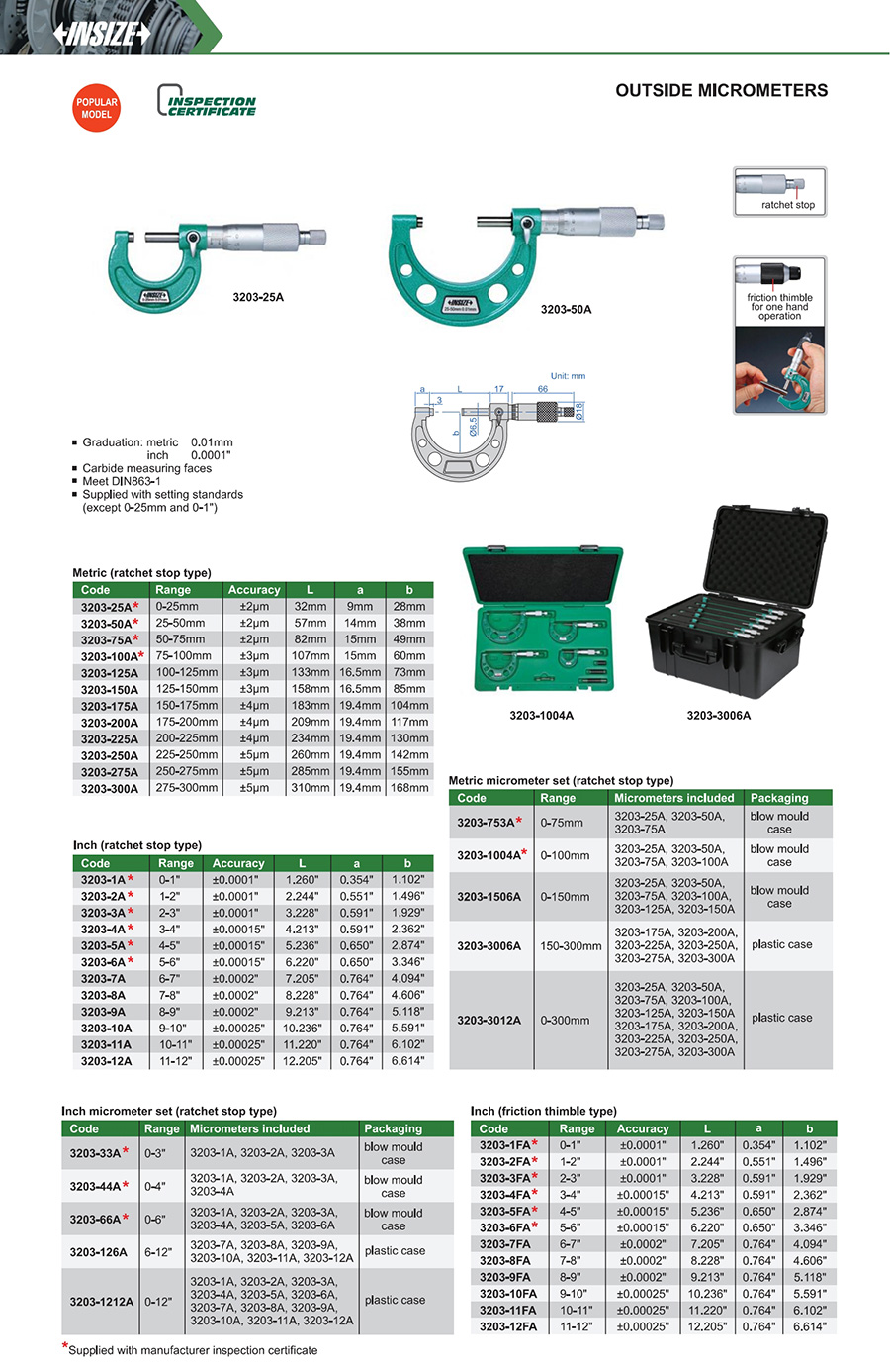 3203-1FA inch (friction thimble) 0-1" ±0.0001" 0.0001"