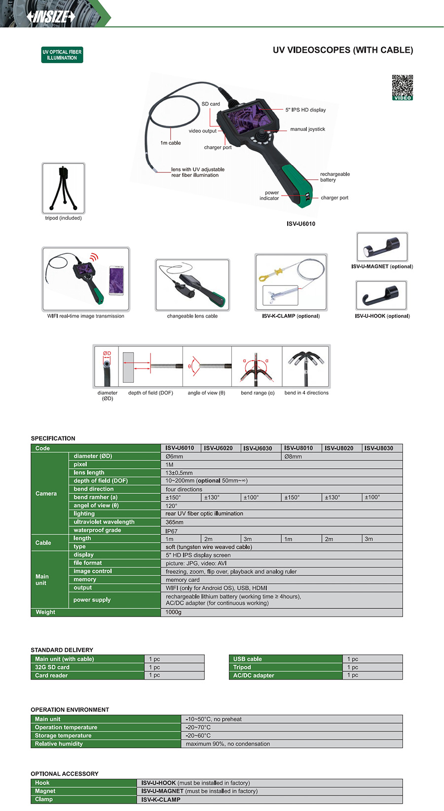 ISV-U8030 1M soft (tungsten wire weaved cable) front view Ø8mm 3m four directions rear UV fiber optic illumination