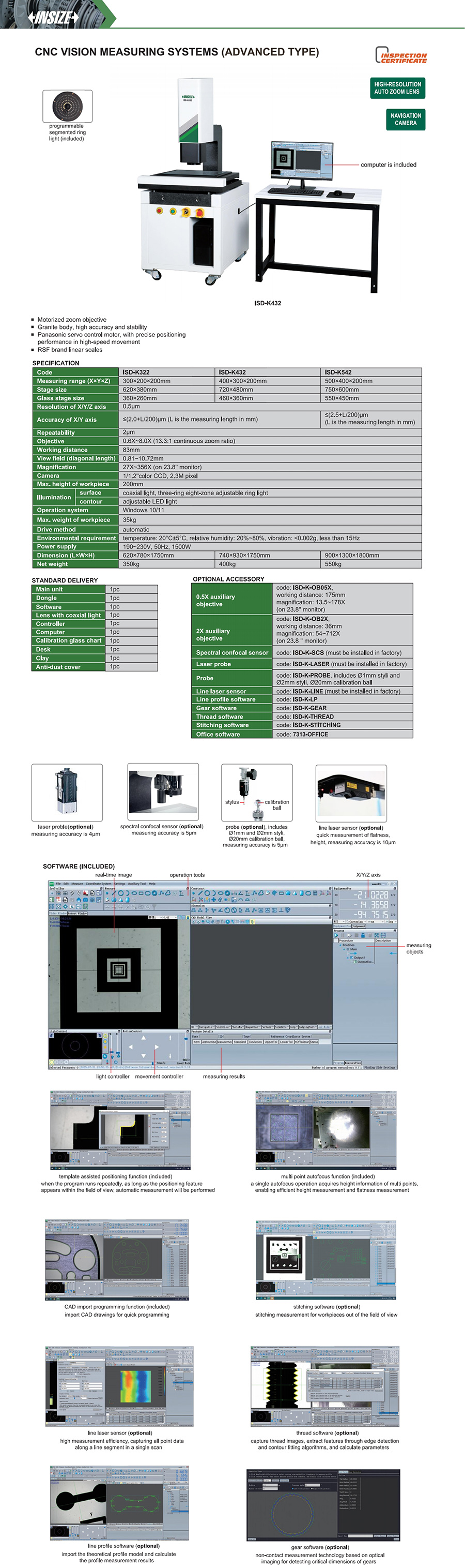 ISD-K432 400×300×200mm ≤(2.0+L/200)µm 0.5µm 2µm 27X~356X (on 23.8'' monitor) 35kg