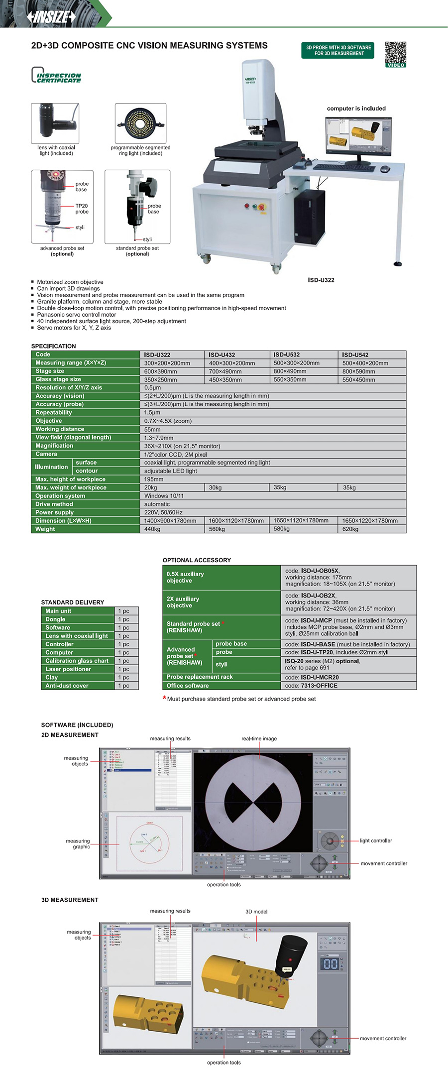 ISD-U322 300×200×200mm vision:≤(2+L/200)μm, probe:≤(3+L/200)μm 0.5μm 1.5μm 36X~210X (on 21.5'' monitor) 20kg